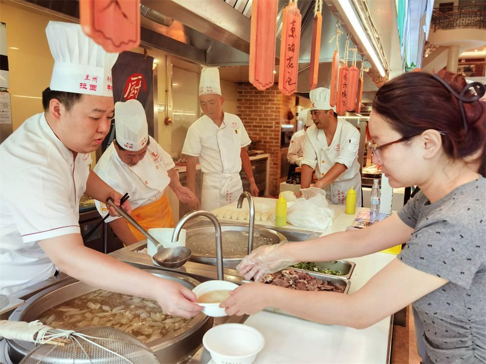 “面、牛肉、調料都是從蘭州帶過來的,就是為了保證大家在西安也能嘗到原汁原味的蘭州牛肉拉面。”甘肅金味德拉面文化產業集團的拉面師傅們也不負眾望,現場展示了蘭州牛肉拉面的正宗做法,讓大家現場感受金城蘭州的“煙火氣”。