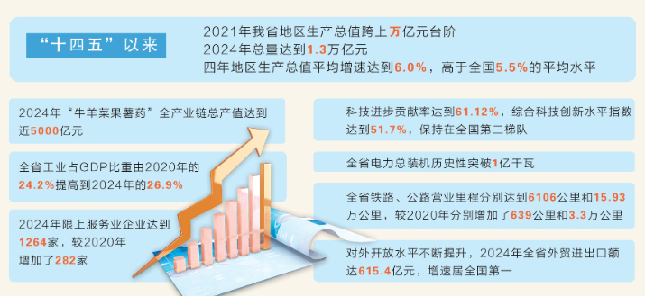 綜合經濟實力實現新躍升。2021年我省地區生產總值跨上萬億元臺階,2024年總量達到1.3萬億元。四年地區生產總值平均增速達到6.0%,高于全國5.5%的平均水平。