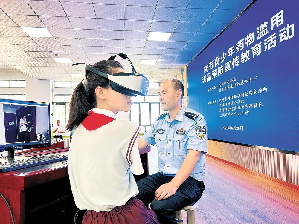 2025年6月26日,蘭州市司法局強制隔離戒毒所干警走進蘭州市第八十六中學開展禁毒宣傳教育。圖為學生佩戴VR眼鏡,通過虛擬現實技術創造逼真的沾染毒品場景,讓學生身臨其境地感受毒品的危害。